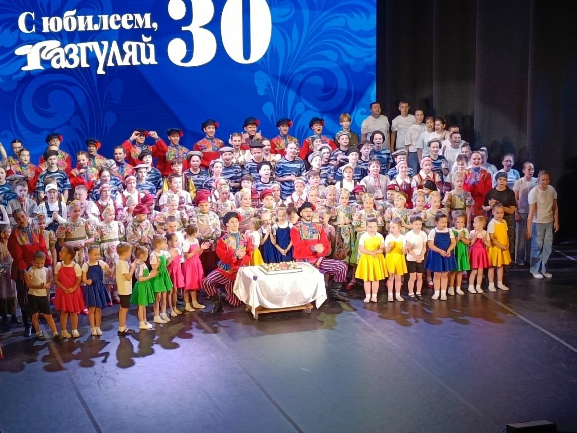 Зрителям была показана концертная программа «Храним наследие России». В нее вошли поздравления от первых лиц города и руководства дворца, вручение подарков и благодарственных писем коллективу, подробный рассказ ведущей вечера Марии Поповой о достижениях ансамбля и его наставниках, поздравительные ролики из разных городов страны и, конечно же, поздравления от родителей и выпускников. В ходе программы с хореографическими композициями на сцену вышли все воспитанники ансамбля, включая особенных ребят из инклюзивной хореографической группы «Разгуляй Плюс». Выпускники коллектива исполнили одну из любимых хореографических композиций «Колдунья». С танцевальным номером на сцене выступили даже родители юных артистов. Трехчасовой концерт, завершившийся общим выходом на сцену участников и выносом торта, прошел под бурные овации зала, став достойной кульминацией тридцатилетнего пути ансамбля.
