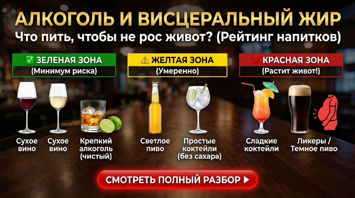 «Я на диете, но скоро праздник. Что можно выпить?» — это самый частый вопрос в декабре. Мы привыкли считать калории в еде, но напрочь забываем про бокалы. А зря. Алкоголь — это не просто «пустые калории». Это мощнейший метаболический тормоз. Вы можете неделю есть одну грудку с брокколи, но одна бурная пятница перечеркнет весь прогресс. И самое неприятное: алкоголь бьет именно в живот, стимулируя рост висцерального жира (того, что обволакивает органы). Значит ли это, что нужно чокаться водой, пока все пьют шампанское? Нет. Нужно просто знать врага в лицо и выбирать «меньшее из зол». Я составил для вас рейтинг безопасности напитков: от «Убийц талии» до «Допустимых исключений». 1. Почему от алкоголя растет именно живот? Дело не только в калориях (хотя в 1 грамме спирта 7 ккал, что почти как в жире).