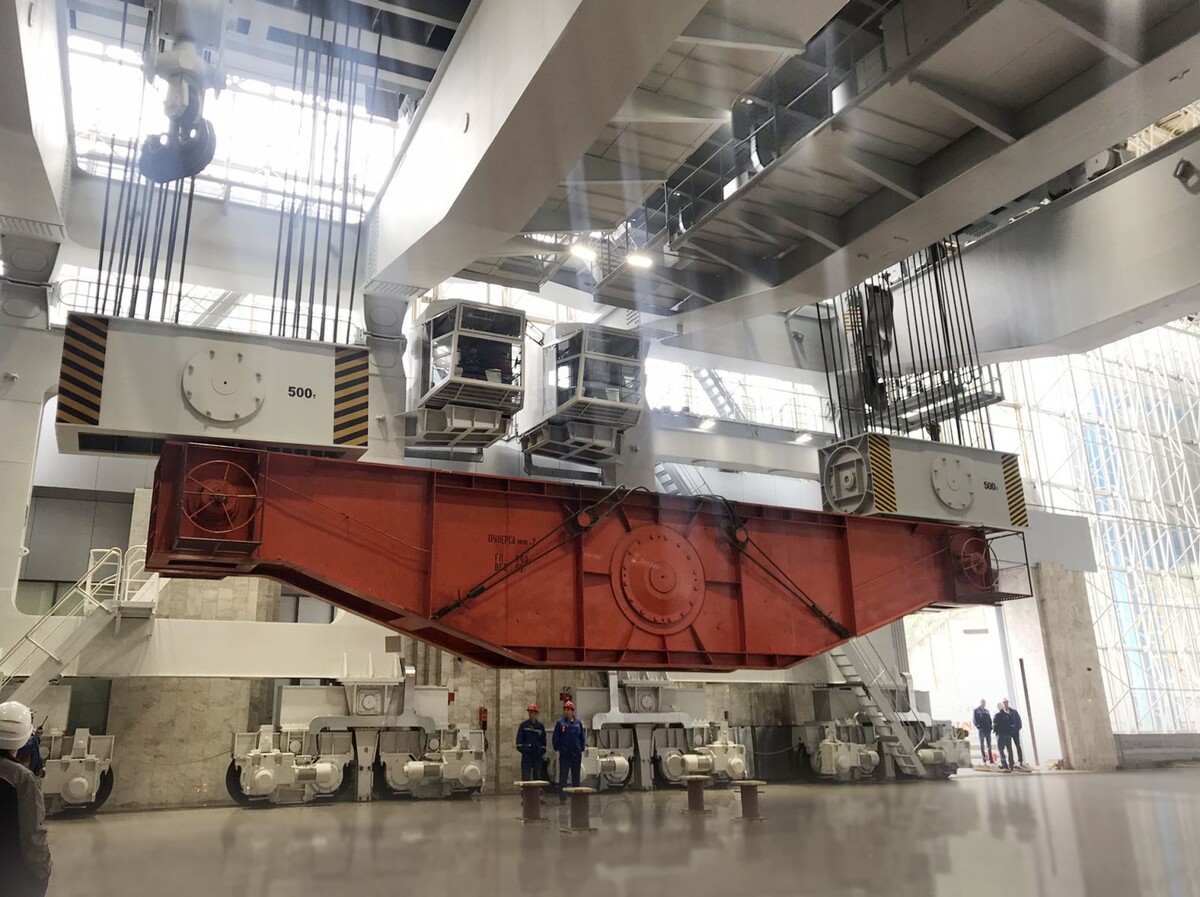Кстати, кран-балка (зачёркнуто) мостовой* кран Саяно-Шушенской ГЭС выглядит на их фоне более скромно, ибо он создан для конкретных задач и грузоподъёмность у него соответственная, то есть там нет нужды поднимать, опускать и таскать одним краном веса больше, чем 500 тонн.