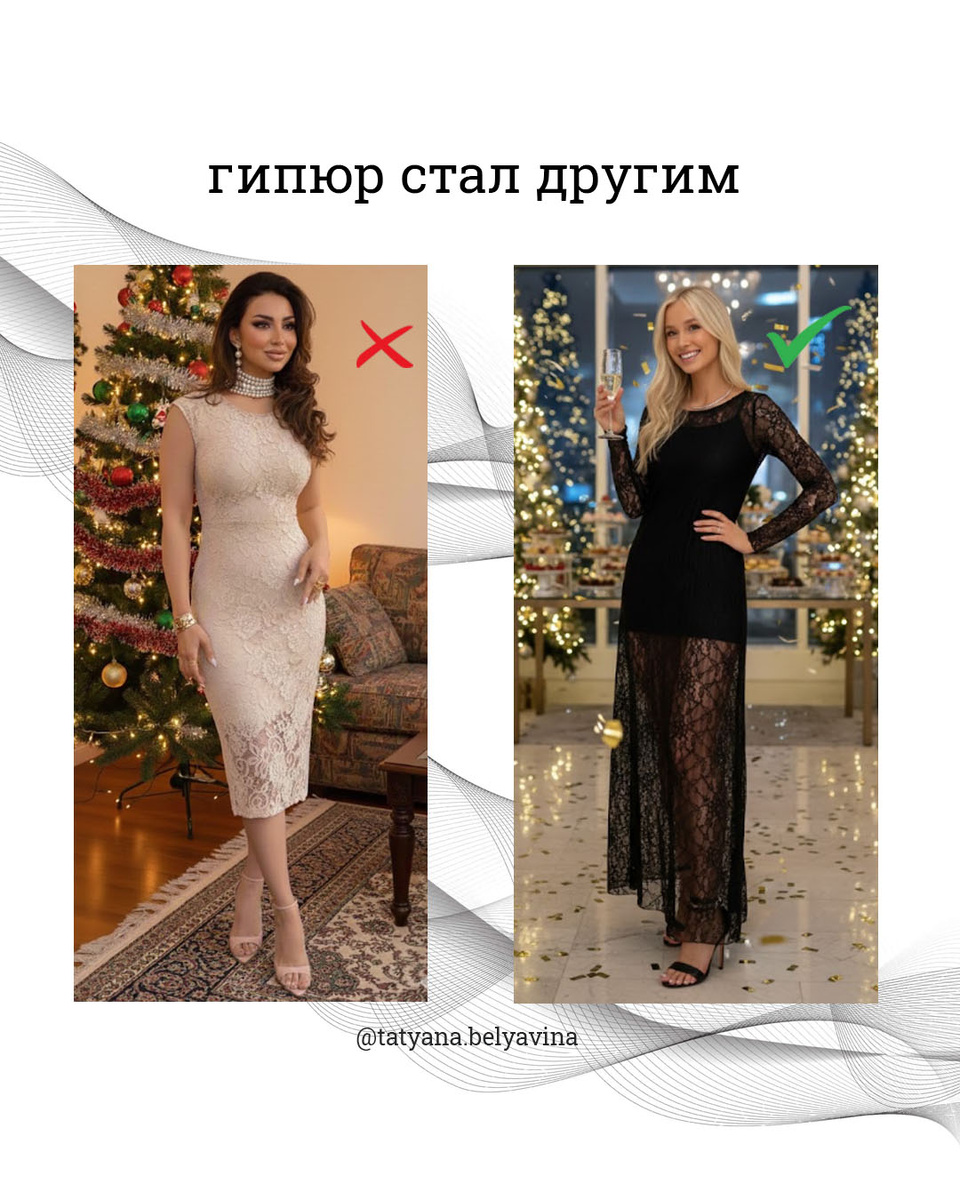 Оно же новое, я его только вчера купила! Самая страшная ошибка — думать, что если платье висит в магазине с новой биркой, значит, оно современное. Ха-ха.Три раза Производители одежды — ребята хитрые (и ленивые). Им ничего не стоит отшить партию платьев по лекалам 2015 года, прилепить ценник 2025-го и ждать, пока вы это купите. И ведь покупают! Это машина времени, которая работает не в ту сторону. Надевая такой фасон, вы транслируете не «я купила обновку», а «я застряла». Застряла во времени, когда этот гипюр считался роскошью, а эти «веселенькие» рукавчики — кокетством Давайте пробежимся по этим «зомби-фасонам», которые живее всех живых на маркетплейсах : Гипюр-чехол. Если ваше кружевное платье напоминает тюль из актового зала — сжигайте. Современное кружево — это воздух, свобода и никакой плотной подкладки, превращающей вас в колбаску.. Платье-халат до колена. Мгновенно превращает роскошную женщину в уставшую домохозяйку в халате. Длина имеет значение! Либо уверенное макси, либо дер