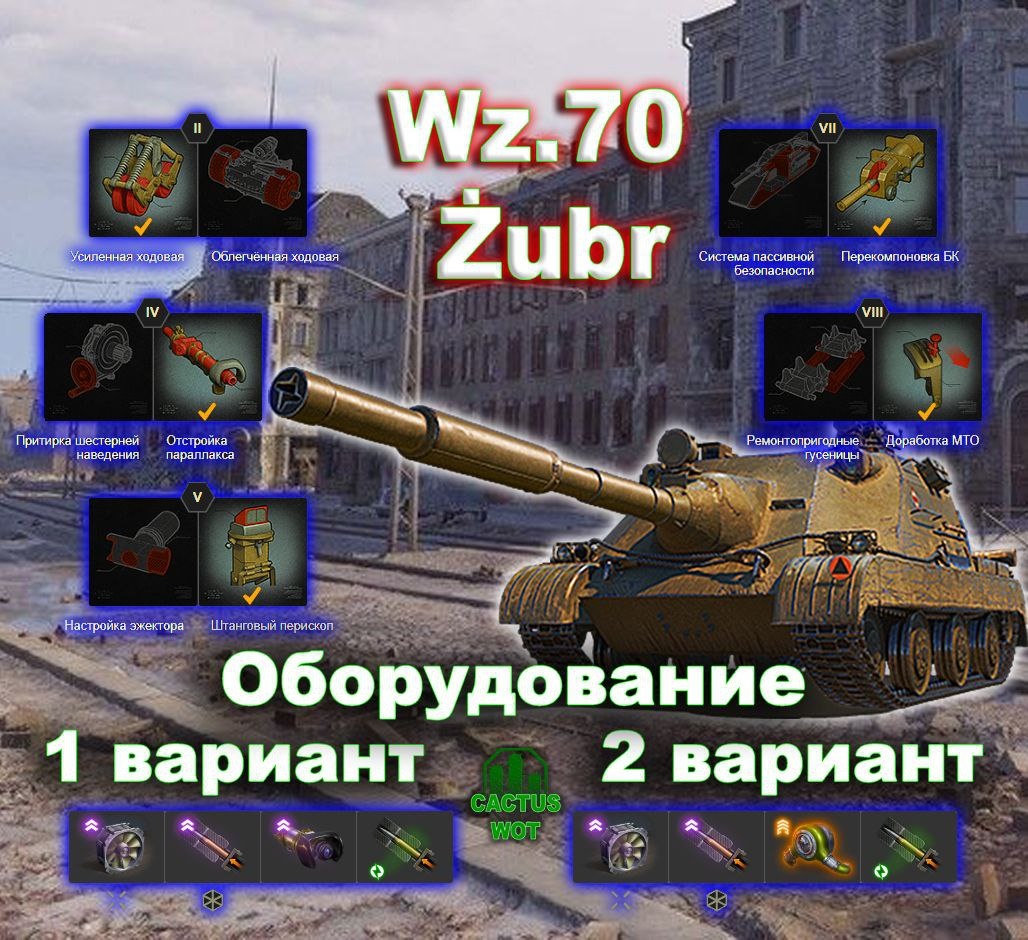 🇵🇱 Wz.70 Żubr 🛕ПТ-САУ штурмовая 10 уровень. Польша. 🔼Оборудование и полевая модернизация на картинке🔼 ТТХ: Калибр (мм) 85 Урон (ед.) 620 / 620 / 780 Бронепробиваемость (мм) 294 / 354 / 85 Скорострельность орудия (выстр/мин) 4.29 Заряжание орудия (с) 14 Скорость гориз. перевода прицела (град/с) 26 Углы поворота башни (град) 10 / 10 Углы вертикальной наводки (град) -8 / 15 Время сведения (с) 2.10 Разброс на 100 м (м) 0.36 Средний урон в минуту (ед./мин) 2657.14 Боекомплект (шт.) 54 Прочность (ед.) 1900 Бронирование корпуса (лоб/борт/корма в мм) 220 / 100 / 60 Время ремонта ходовой (с) 12.03 Масса (кг) 56390 Мощность двигателя (л.с.) 750 Удельная мощность (л.с./т) 9.78 Макс. скорость / задний ход (км/ч) 30 / 16 Скорость поворота шасси (град/с) 30 Время перехода в осадный режим (с) 3 Время перехода в походный режим (с) 3 Незаметность Неподвижной машины (%)0.30 В движении (%) 0.18 Обзор (м) 370 Дальность связи (м) 730 ➕Плюсы: 📈Высокая скорость полёта снарядов 📈Низкая потеря брон