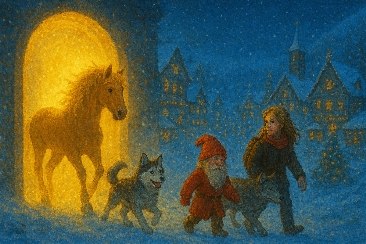Портал вспыхнул настолько ярко, что даже снег вокруг засверкал, будто стал зеркальным. Илья почувствовал лёгкое покалывание в воздухе, как бывает перед грозой, только вместо грома слышался мягкий звон, словно тысячи маленьких колокольчиков поют вместе. Хоп-Хоп шагнул в портал первым — его грива засветилась золотом, а копыта оставляли в воздухе искры. Хаски прыгнул за ним, крутясь и смеясь: — Уииии! Порталы — это лучше горки! Эви аккуратно перешагнула через сияющий порог, а Волкодав — спокойно, уверенно, как будто делал это каждый день. Волчонок Ау замялся, но Илья погладил его по голове. — Не бойся. Я с тобой. Вместе они шагнули внутрь. Мир мгновенно изменился. Теперь вокруг были высокие заснеженные дома, украшенные яркими огнями. В воздухе пахло жареными каштанами, горячим шоколадом и волшебством — тем самым, настоящим, которое бывает только в Адвент. Перед ними раскинулся Обервизенталь — маленький городок в снежных горах. Его улицы сияли гирляндами, а на каждой крыше стояли