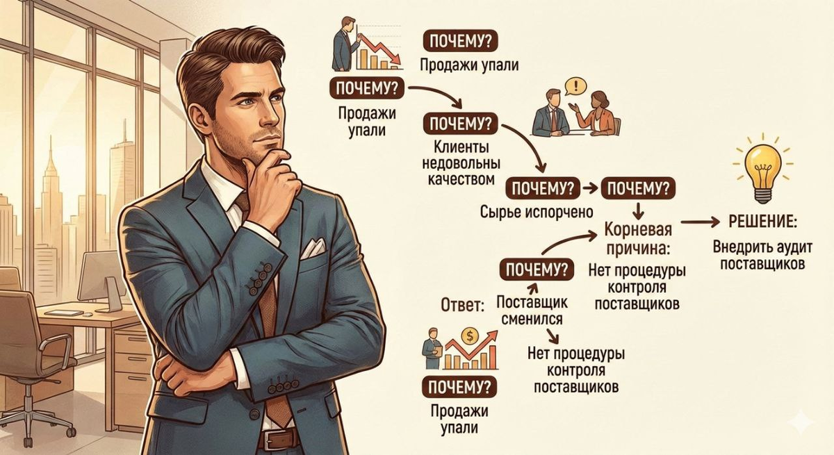 Потому что… а вдруг «нет» — это не упрямство. А граница, выросшая из чего-то совсем другого? Как раз в таких случаях на помощь приходит не «переубедить», а понять. И одна из самых простых, но мощных техник для этого — «5 почему». Да-да, та самая, которую придумал Сакичи Тоёда (как часть системы Toyota Production System ещё в 30-х годах XX века). Давайте попробуем «прогнать» через неё эту сцену — не как переговорщики, а как