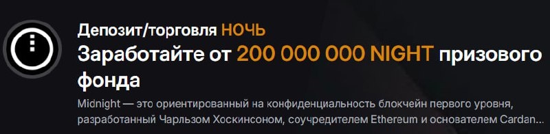 😎🥸😎🥸😎🥸😎 💵Листинг NIGHT на Bybit На Bybit запустился Token Splash - листинг токена Night со своим блокчейном 15 декабря с 10:00 до 12:00 UTC. ✅ $10 каждому квалифицированному пользователю (пул $20000). Отличная возможность для старта. 🟢Зарегистрируйтесь по ссылке ниже, проходим KYC. 🟢Нажмите кнопку «Зарегистрироваться для участия» на странице Token Splash. 🟢Внесите первый депозит от 100 USDT и совершите торговый оборот в паре NIGHT/USDT. Можно просто купить и продать. 🟢Награды распределяются в порядке очереди (FCFS), поэтому рекомендую не откладывать. 👉 Новый листинг на Bybit: NIGHT https://partner.bybit.com/b/nightbonus