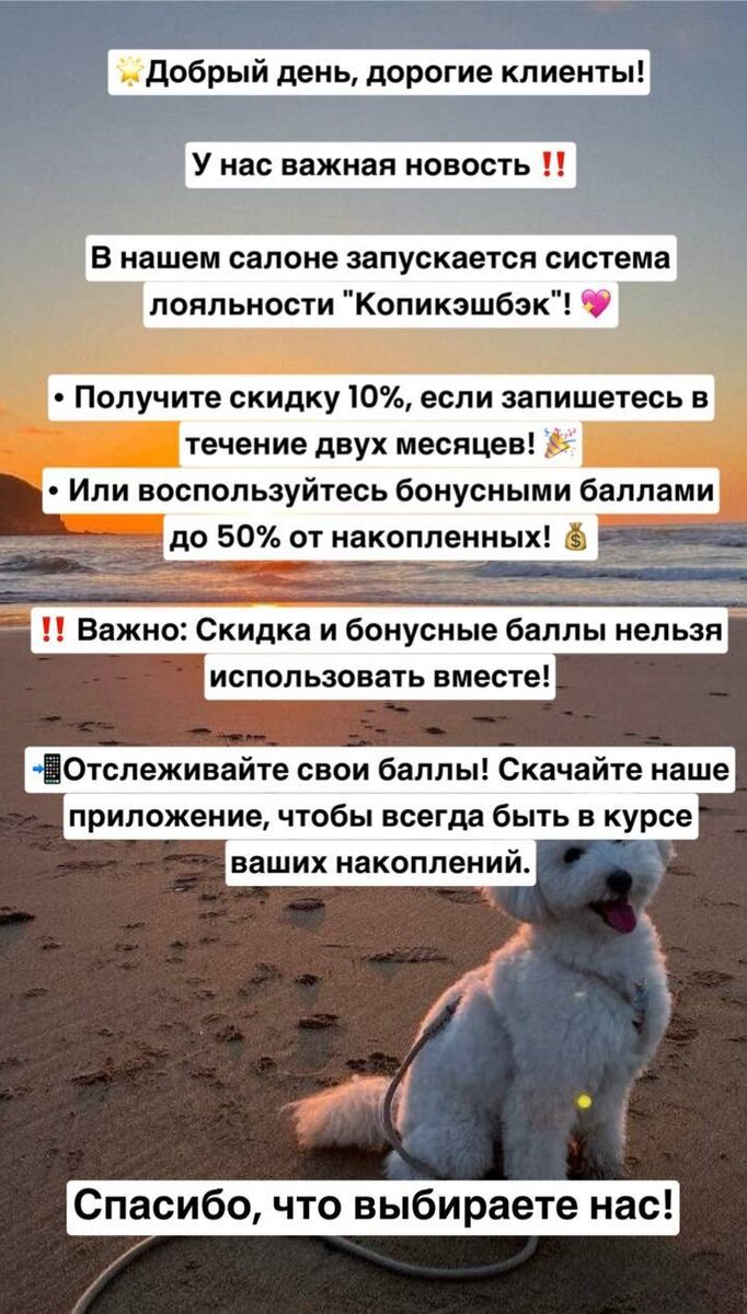 🌟Добрый день, дорогие клиенты! У нас важная новость ‼️ В нашем салоне запускается система лояльности "Копикэшбэк"! 💖 Сеть груминг салонов по уходу за питомцами🥰 📞8(843)2-400-420 📞 +7904762-54-05 Ибрагимова 24 📞 +7904762-65-52 Фучика145, Павлова 13 Наши адреса: Фучика 145, Ибрагимова 24, Павлова 13 ⏰работаем ежедневно по записи #зоосалон #груминг #питомцы #цацагрум