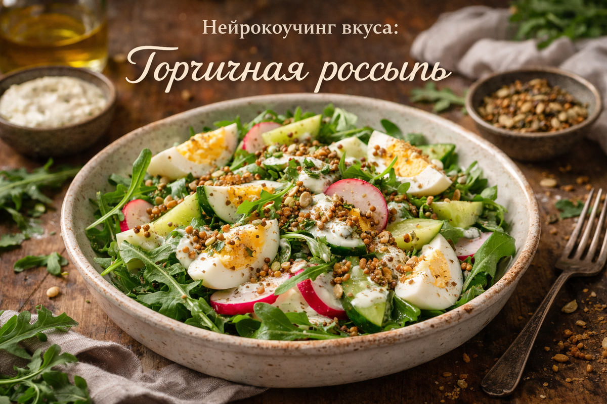 Редис, огурец и яйцо на руколе, с тёплой горчичной крошкой и мягким кремом Иногда вкус не требует фанфар — ему достаточно тонкой работы контрастов: прохлада и теплая нота, хруст и нежность, зелёная горчинка и сливочная гладь. В такие минуты привычный салат перестаёт быть «просто салатом» и становится маленькой паузой внимательного присутствия. Ингредиенты Руккола — 2 горсти, зелёная упругость, база, на которой держится движение вкуса.