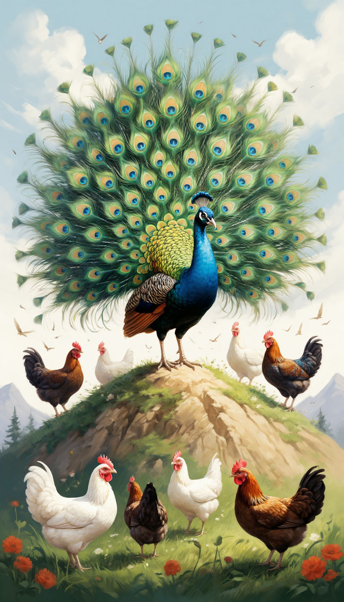 Илларион, обладая природным обаянием, стал транслятором. Его прогулки превратились в перформансы, распушенный хвост - в манифест, а его пронзительный, немного надменный крик «Ми-и-иау!» (так кричат павлины) куры расшифровывали как глубокомысленное: «Будьте не как все. Будьте как Я».