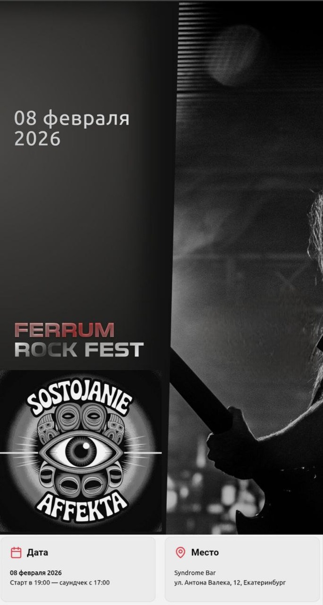 🔥 ГОД НАЧИНАЕТСЯ С РОК-ФЕСТА! Мы горды объявить: SOSTOJANIE AFFEKTA выступают на Ferrum Rock Fest 2026! Это будет вечер, который задаст тон всему году — мощный звук, живая энергия и море драйва. 🎸 8 ФЕВРАЛЯ 2026 ⏰ СТАРТ В 19:00 📍 Syndrome Bar (Екатеринбург, ул. Антона Валика, 12) https://t.me/FERRUM_ROCK_FEST https://ferrumrockfest.ru/ Ждём всех, кто готов зажигать, кричать и забыть о зиме на несколько часов! Рассказывайте друзьям, отмечайтесь в комментариях — будем готовить сюрпризы. С любовью, ваши SOSTOJANIE AFFEKTA