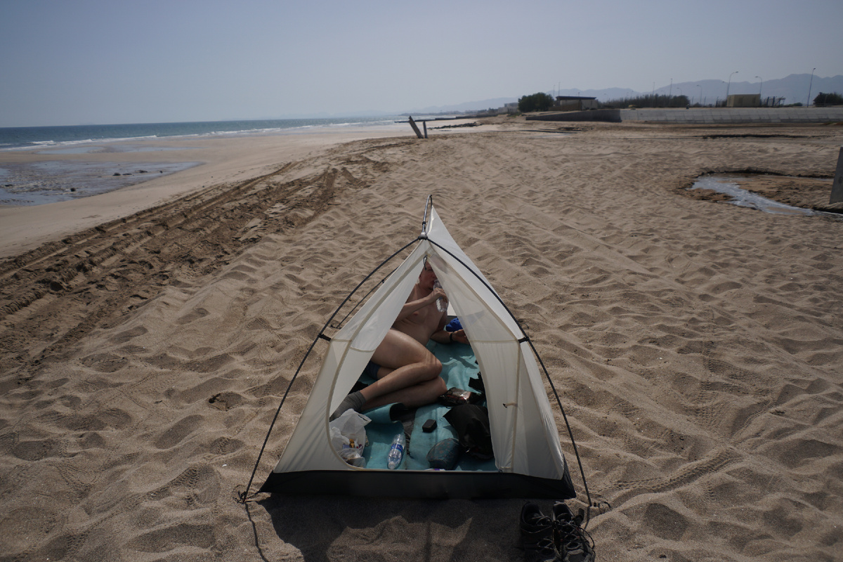 Утром жарко. Палатку взяли с собой супер легкую летнюю двухместную палатку Naturehike. При наших габаритах в палатку кроме нас самих помещались только ценные вещи, все остальное оставалось снаружи. Расчет был на погоду без дождя и на то, что кемпиться в Омане безопасно. Все расчеты оправдались. Практически все ночи на палатку не накидывали тент, поэтому то, что на стенках палатки из сетки снизу есть непрозрачная ткань было очень удобно.