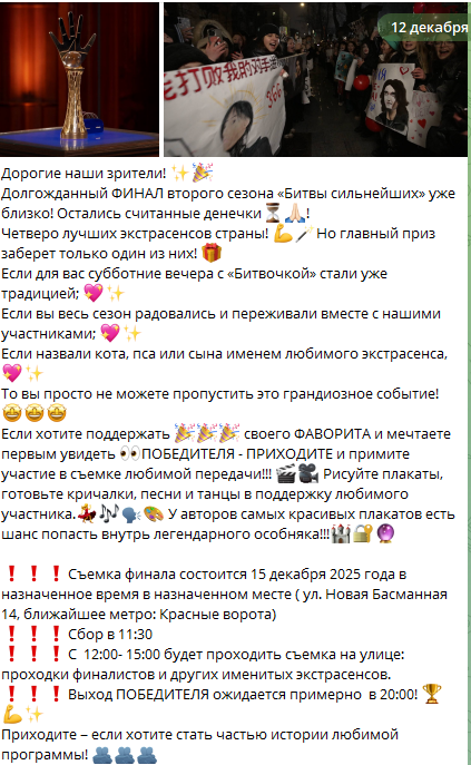 Всем привет! Совсем скоро Финал реалити ТНТ - "Битва сильнейших" второй сезон. Покажут последнюю серию в субботу, 20 декабря 2025.