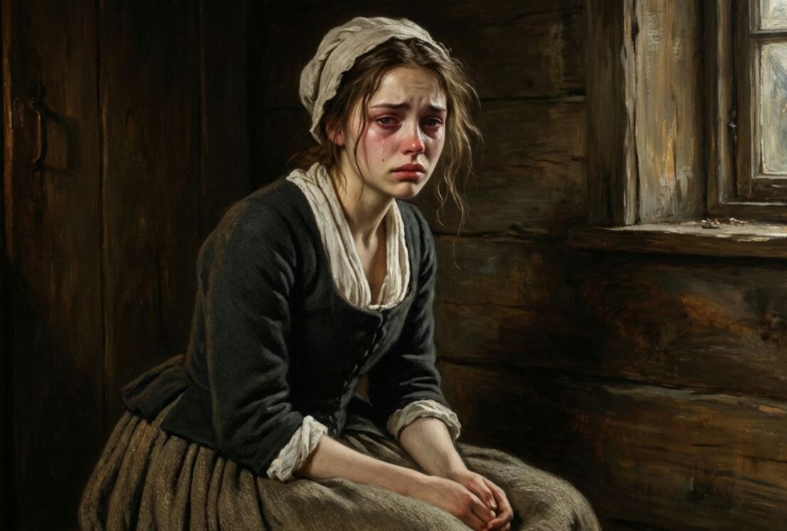 Та стояла у верёвки, вместе с Полиной вешала мокрые рубахи. Волосы её подсохли неровными тёмными прядями, а глаза… глаза были такие, будто она несла в себе вину за всё, что случилось на свете.
