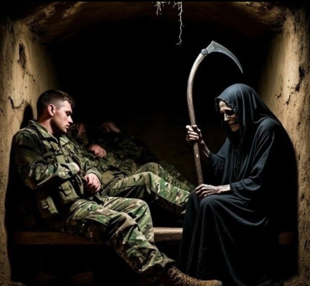 Подпишись на канал, мы стараемся и развиваемся для тебя. Ничто не летало. Шëл дождь третий день. Нам отдых нежданный короткий. Мы все отсыпались. Вставать было лень, хоть чаем мани или водкой. Дрожащий огонь от окопной свечи, Хоть что-то, как рак на безрыбье. Вдруг кот неожиданно быстро вскочил и шерсть злобным ёжиком вздыбил. Шаги по грязи. И опять тишина. Кого чëрт несëт в непогоде? И сеть на двери отодвинув, ОНА, Устало и горбясь, заходит. На ящик снарядный у двери присев. - Ну, здравствуйте что ли...- сказала. И, место найдя мокрой, чёрной косе, - Не дергайтесь, вы! Я устала. Попробуйте сами который уж год... Без отдыха, сутками... Взвоешь! Мы все оробели. Шипел злобно кот. Макар крест держал пред собою. - Бруска не найдётся? А может, наждак? Косу мне поправить бы надо. А я, крайний к двери, застыл, как дурак. - Не бойтесь уже! Вот досада! Куда ни зайди, всех как ступор берёт. А то в первый раз повстречали? Не нужен мне ваш, мною меченый взв