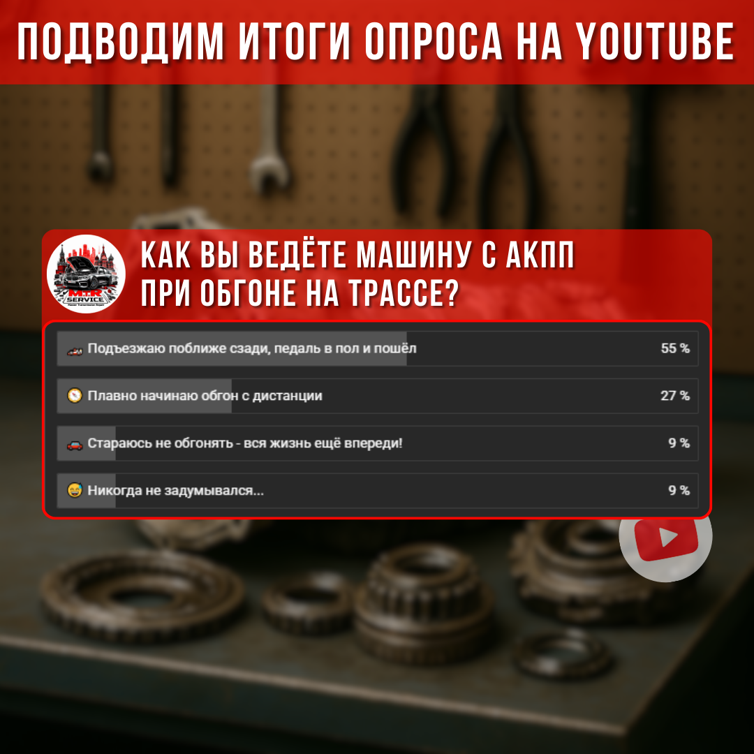 👋🏼 Друзья, на связи MTR Service! ⭐️ По итогам опроса большинство участников выбирают резкий обгон с кикдауном. Почти каждый третий старается делать это плавно, а небольшая часть либо избегает обгонов, либо не задумывается о работе коробки в этот момент. 🏎 Теперь по сути. Резкий обгон с педалью в пол — одна из самых серьёзных нагрузок для АКПП. Коробка резко понижает передачу, давление в системе растёт, фрикционы и гидроблок работают на пределе. Если масло уставшее или есть износ, именно в такие моменты появляются пинки, пробуксовки и перегрев. 🧭 Плавный обгон с дистанции для коробки куда безопаснее. АКПП заранее понимает нагрузку, переключения проходят мягче, без скачков давления. Это напрямую влияет на ресурс и общее состояние трансмиссии. 🛠 Машины после активной езды по трассе чаще приезжают с перегретым маслом и износом АКПП. 📝 Записывайтесь на диагностику АКПП. Проверим состояние без навязывания лишнего. ☎️ Пишите в WhatsApp: Wa.me/79958474755 А как вы обгоняете автомобили н