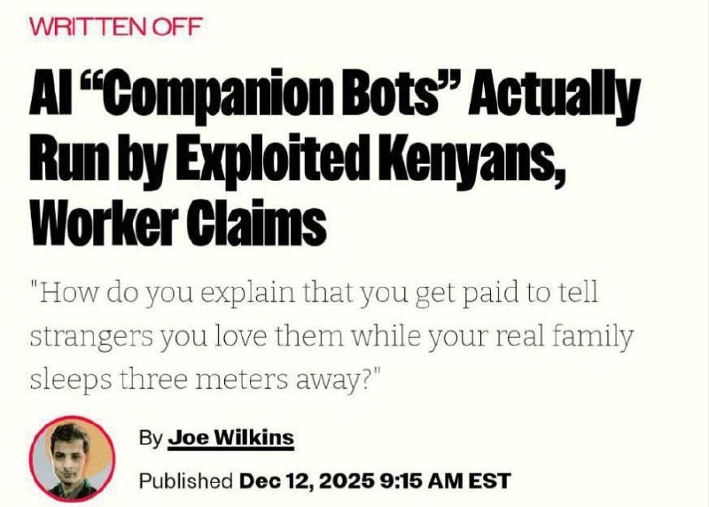 🤖 Вместо ИИ — колл‑центр в Кении Австралийская «ИИ-компания» оказалась обычным колл‑центром: вместо нейросети с клиентами переписывались живые люди в Кении. Сотрудники под видом «виртуальных девушек» вели романтические и интимные чаты с одинокими американцами, верящими в магию ИИ. За сообщение платили по 5 центов, главная задача — вытянуть продление подписки. Технологии будущего, эксплуатация из прошлого.