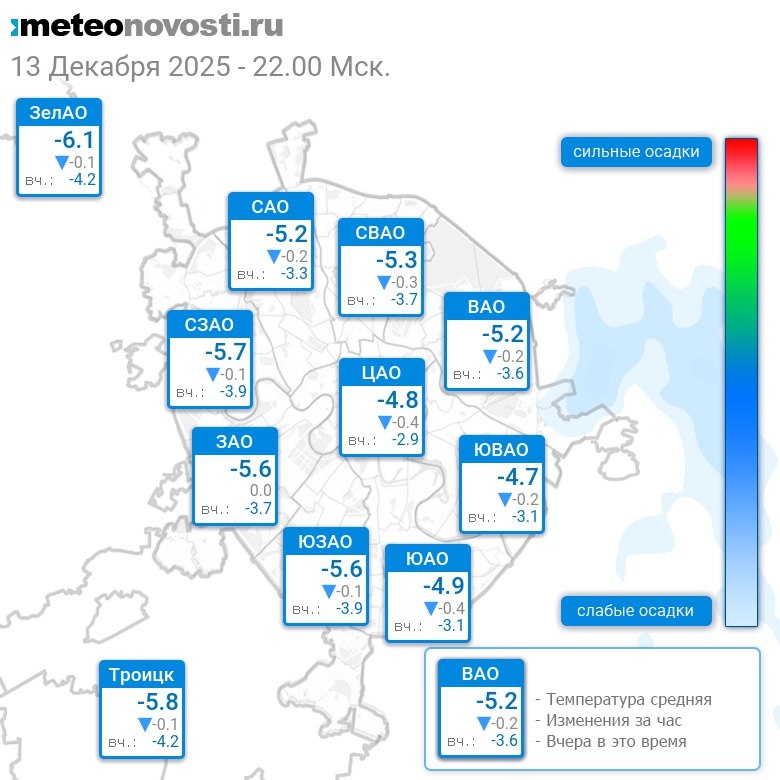 В 22:00 в Москве было от -6.3°C до -4.3°C, средняя температура -5.2°C #погода #Москва #зима #температура #13декабря #суббота