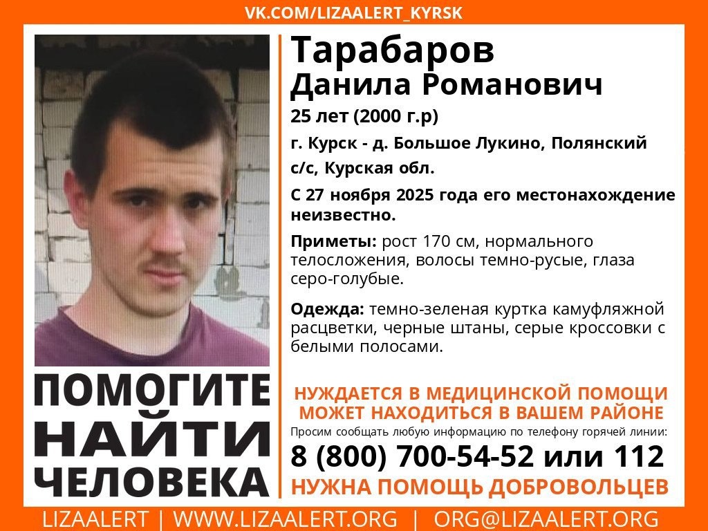 В Курской области пропал 25-летний Данила Тарабаров В Курской области пропал 25-летний Данила Тарабаров. об этом сообщили добровольцы отряда "Лиза Алерт Курская область". Молодого человека последний раз видели в деревне Большое Лукино, Полянского сельсовета. - Его местонахождение неизвестно с 27 ноября 2025 года. Курский отряд LizaAlert просит помощи в его поиске, - подтвердили добровольцы. Его рост 170 сантиметров, глаза - серо-голубые, волосы - темно-русые.