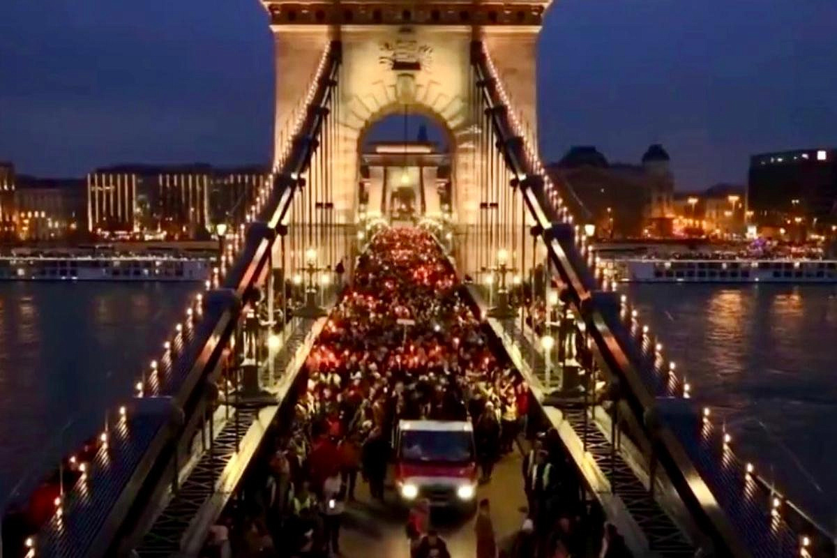 Вечером в центре Будапешта собрался поток людей — без карнавала и без привычной митинговой суеты. Факелы, плюшевые игрушки, свечи. У