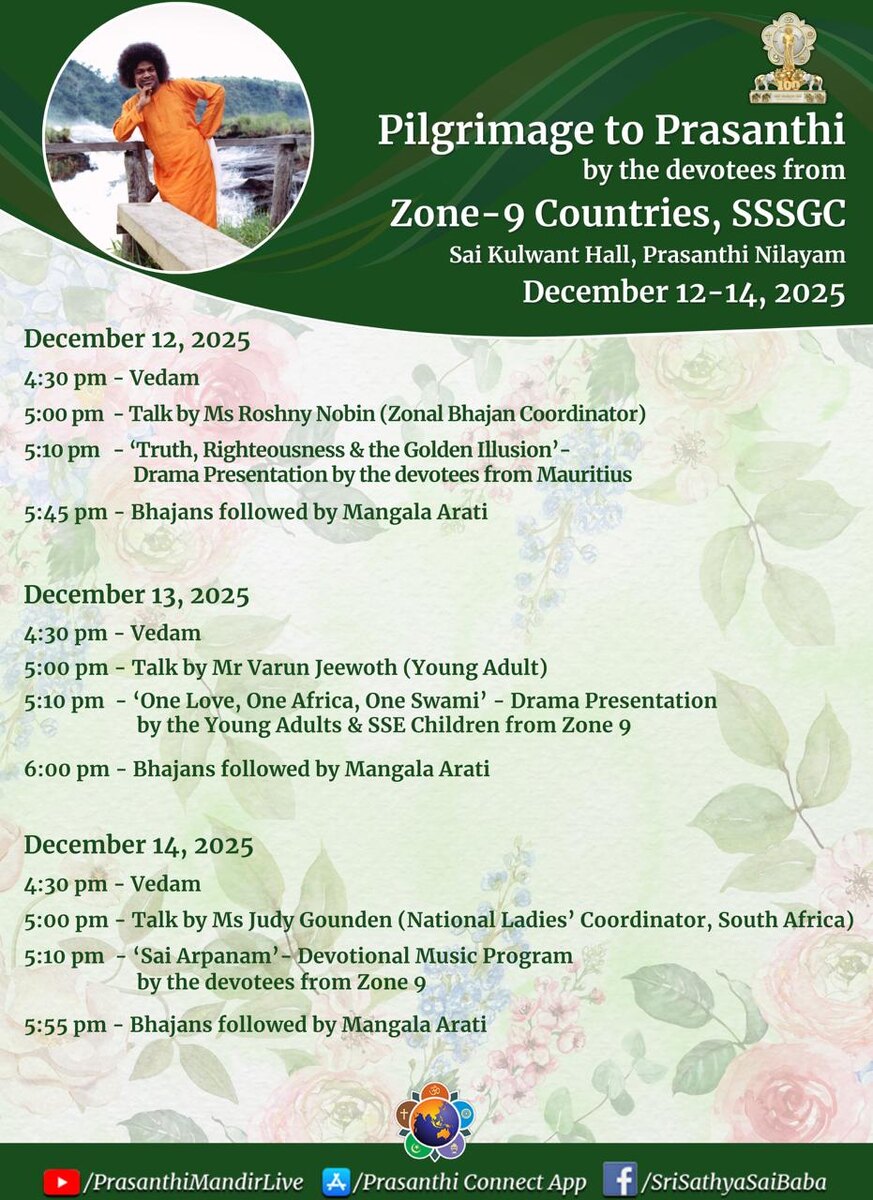 ⭐️ Насладитесь Божественной атмосферой Прашанти Нилаям Паломничество преданных из стран 9-й зоны Глобального Совета Шри Сатья Саи в Прашанти Саи Кульвант Холл, Прашанти Нилаям 12-14 декабря 2025 года 12 декабря 2025 г. 16:30* — Веды 17:00 — Лекция г-жи Рошни Нобин (координатор бхаджанов) 17:10 — Драматическая постановка преданных из Маврикия «Истина, праведность и золотая иллюзия» 17:45 — Бхаджаны и Мангала Арати 13 декабря 2025 г. 16:30 — Веды 17:00 — Лекция г-на Варуна Дживота (молодежная группа) 17:10 — Драматическая постановка группы молодежи и детской группы из SSE (Духовное образование Шри Сатья Саи) 9-й зоны «Одна любовь, одна Африка, один Свами» 18:00 — Бхаджаны и Мангала Арати 14 декабря 2025 г. 16:30 – Веды 17:00 – Выступление г-жи Джуди Гунден (национальный координатор по делам женщин, Южная Африка) 17:10 – Музыкальная программа преданности преданными из 9-й зоны «Саи Арпанам» 17:55 — Бхаджаны и Мангала Арати *время по Индии, время по Москве - минус 2.5 часа от ука