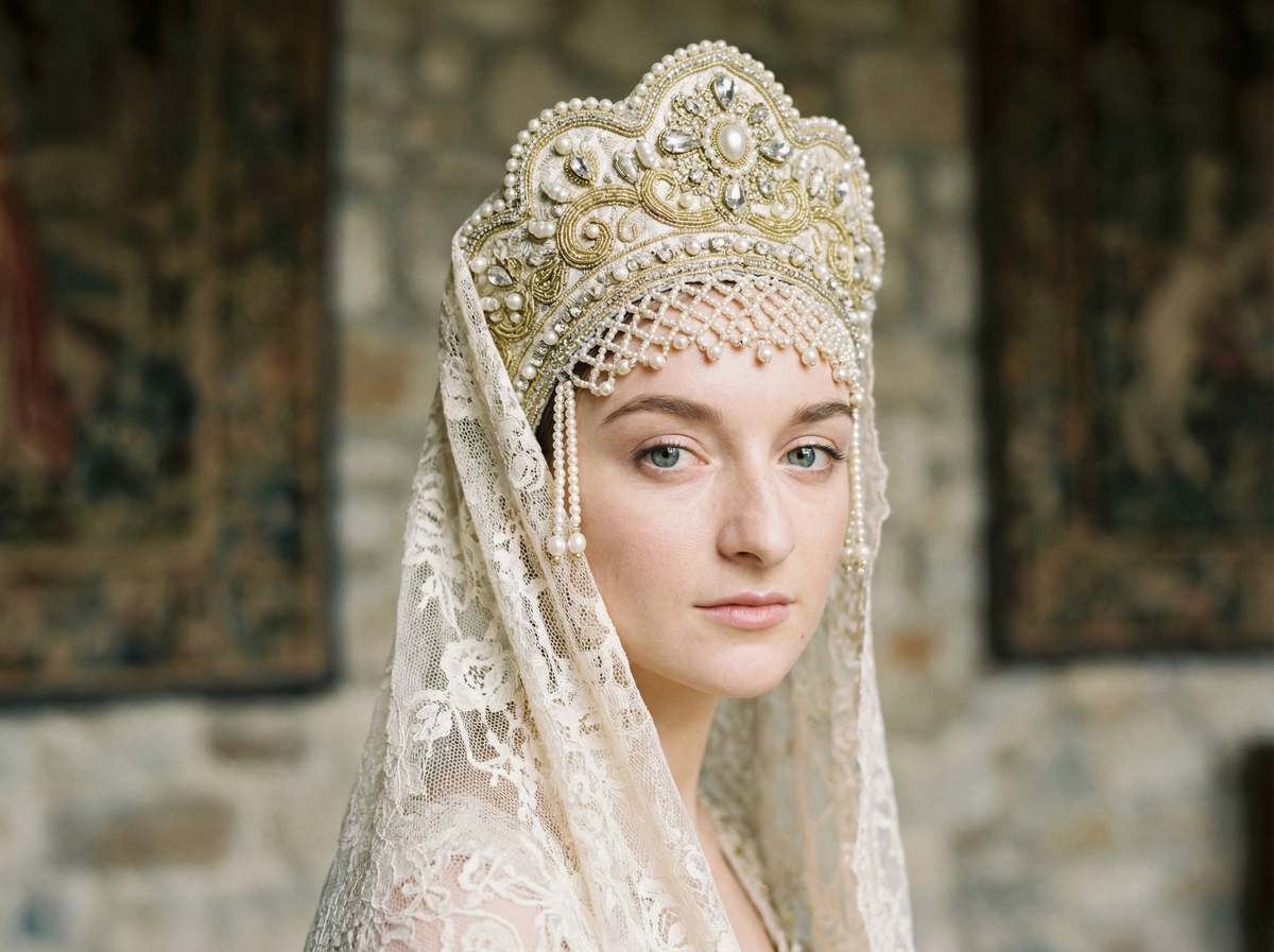 A single young woman with ethereal Slavic features, pale porcelain skin, soft natural makeup, and calm introspective expression. She is wearing an ornate traditional-inspired bridal headdress richly decorated with pearls, crystals, and fine metallic embroidery. A delicate lace veil drapes over her head and shoulders. The outfit is luxurious, historical, and couture-like, inspired by Eastern European and medieval royal aesthetics.