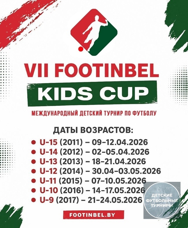 🌍 Международный детский турнир по футболу 🇧🇾 Место проведения: Беларусь, д.Волма (Ссылка (на Яндекс карты): https://yandex.by/maps/-/CHvanP35) FOOTINBEL снова собирает сильнейшие команды и дарит детям атмосферу большого футбольного праздника! ⚽🔥 📅 Даты возрастов: U-15 (2011) — 09–12.04.2026 U-14 (2012) — 02–05.04.2026 U-13 (2013) — 18–21.04.2026 U-12 (2014) — 30.04–03.05.2026 U-11 (2015) — 07–10.05.2026 U-10 (2016) — 14–17.05.2026 U-9 (2017) — 21–24.05.2026 ✨ Что ждёт участников на турнире: 🎥 Прямые эфиры всех матчей 🏞 Живописное место проведения ⚽ Футбольные конкурсы 🎖 Медали каждому участнику 🏆 Много индивидуальных номинаций 🔥 Торжественное открытие и закрытие турнира FOOTINBEL — это не просто турнир. Это эмоции, развитие, мечты и настоящая футбольная атмосфера! Контакты: +375 25 934 43 39 (Viber, WhatsApp, Telegram) -— #ФутбольныйТурнирАпрель2026 #ФутбольныйТурнирМай2026 #ФутбольныйТурнирБеларусь2026 #ФутбольныйТурнирВолма2026 #ФутбольныйТурнирБеларусь2011гр #Футбольн
