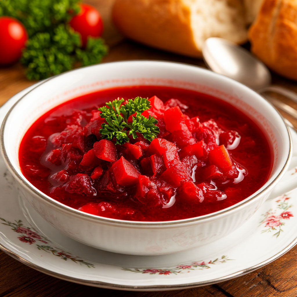 Борщ — один из самых запрашиваемых супов в русскоязычном интернете. По данным поисковых систем, ежемесячно его ищут более 500 000 раз. Разберём классический рецепт с секретами идеальной насыщенности и яркого цвета. Время приготовления: 2 часа 30 минут Порции: 6–8 Ингредиенты говядина на кости — 600 г; свёкла — 200 г (1 шт.); картофель — 300 г (3–4 шт.); капуста белокочанная — 300 г; морковь — 100 г (1 шт.); лук репчатый — 100 г (1 шт.); томатная паста — 2 ст. л.; уксус 9 % — 1 ст. л. (или лимонный сок); чеснок — 3 зубчика; лавровый лист — 2 шт.; соль, чёрный перец — по вкусу; растительное масло — 2 ст. л.; зелень свежая (укроп, петрушка) — для подачи; сметана — для подачи. Пошаговый рецепт 1. Бульон. Мясо промойте, залейте 3 л холодной воды. Доведите до кипения, снимите пену. Варите на медленном огне 1,5 часа. Процедите бульон, мясо нарежьте кусочками. 2. Подготовка овощей. Свёклу натрите на крупной тёрке. Морковь натрите, лук мелко нарежьте. Ка