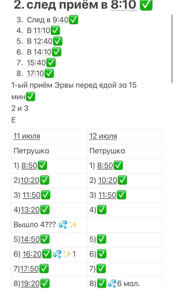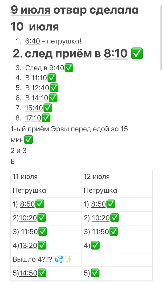 Примечание: Я носила с собой бутылочку с отваром петрушки и строго по времени принимала даже в метро в час пик :)) Вам должно быть все-равно, что подумают люди, что это вы такое зеленое пьете... Можно пить незаметно. Отхлебнули на глаз и спрятали в сумку. Здоровье важнее! Прикрепляю свои заметки для наглядного примера.