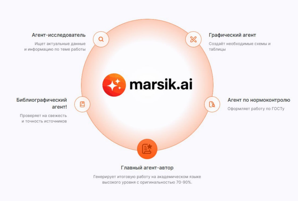 Марсик Эй Ай – это сервис, который за 5–10 минут собирает студенческую работу с уникальностью 70–90 %, оформлением по ГОСТ.