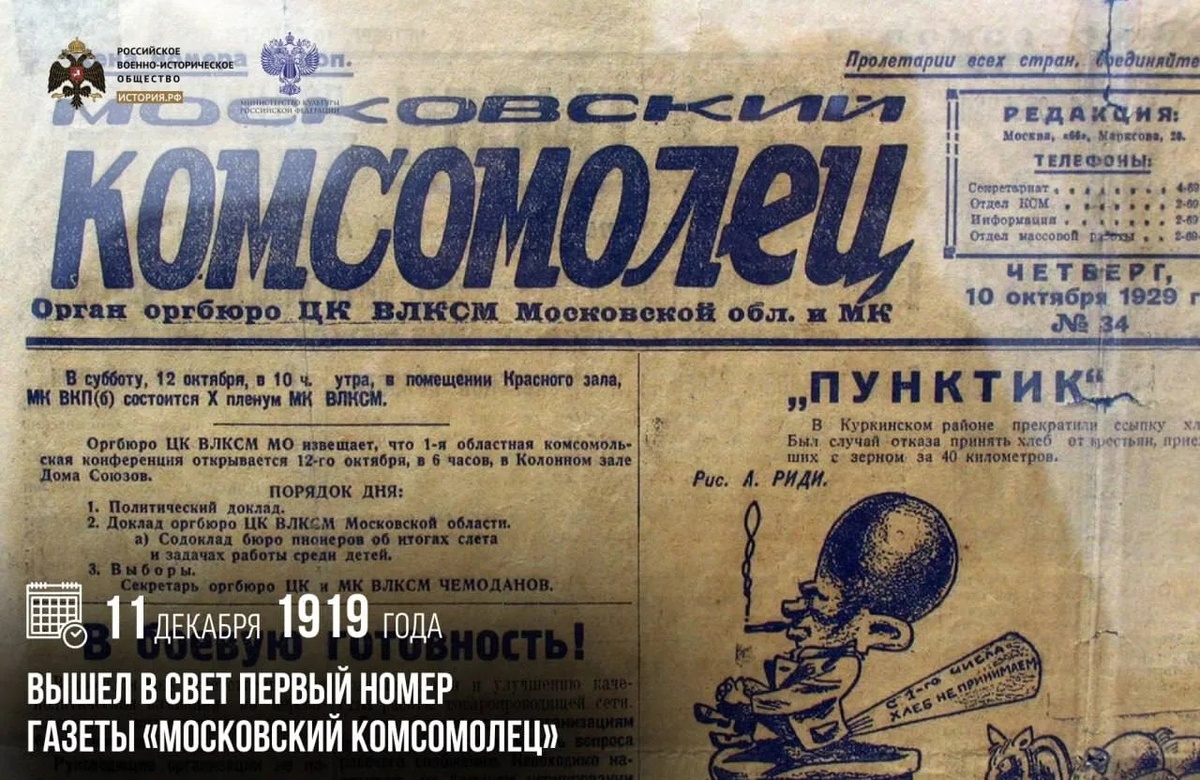 11 декабря 1919 года вышел в свет первый номер газеты «Московский комсомолец» В то время издание называлось «Юный коммунар». Но уже спустя несколько месяцев получило новое наименование — «Юношеская правда». После смерти Ленина газета была переименована в «Московского ленинца». Современное название она обрела лишь в сентябре 1929 года. В 1970-е годы «Московский комсомолец» рассказывал о неформальных движениях молодежи, современной музыке и кинематографе. Популярна была рубрика «Звуковая дорожка», информировавшая о советских исполнителях и звездах эстрады. 11 декабря 1871 года в Санкт-Петербурге открылась первая выставка передвижников На ней свои работы показали 16 художников — всего 47 произведений, охвативших многие жанры: исторический, бытовой, пейзаж и портрет. Первая выставка передвижников произвела фурор и привлекла огромное по тем временам число зрителей. Из Петербурга выставка отправилась в Москву, затем в Киев и Харьков. Завершающая 48-я выставка состоялась в Москве в 1923
