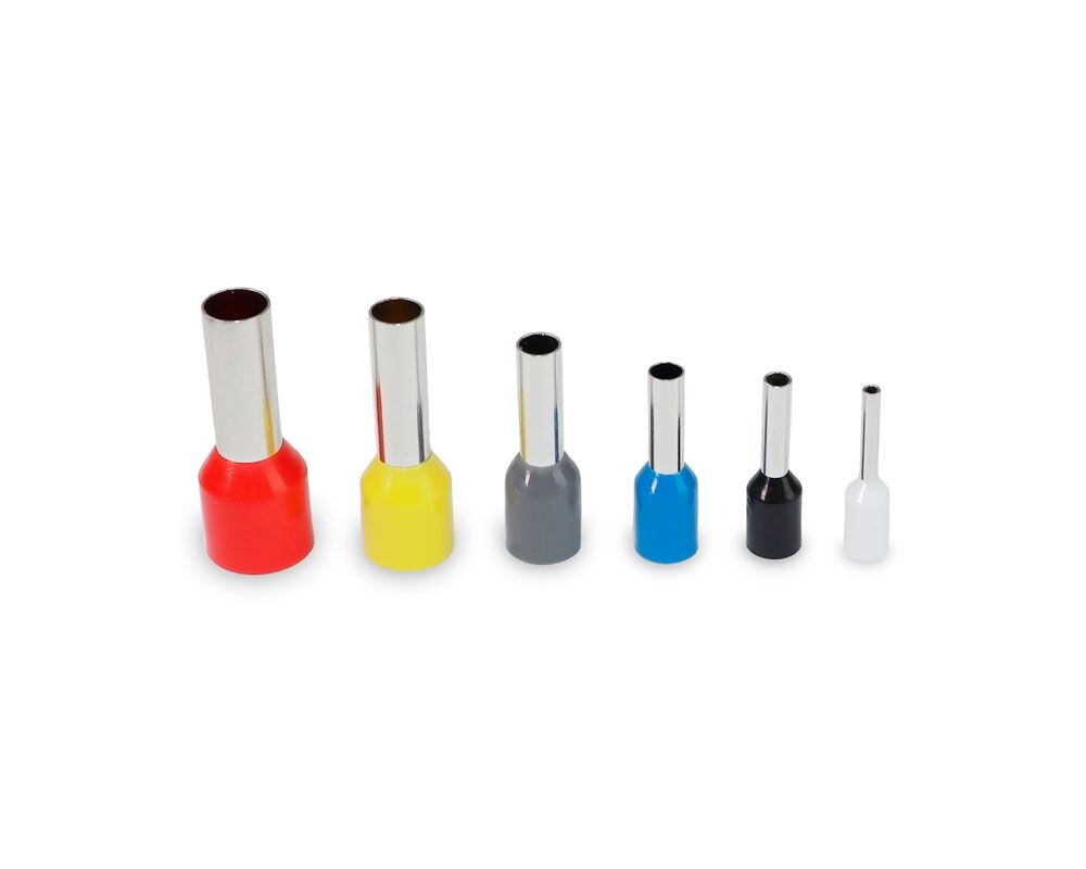 Конструкция: медная луженая трубка толщиной 0,25-0,5 мм, штырь Ø1,5-4 мм, ПВХ-колпачок. Работают от -40 до +80°C, до 400 В. Размеры от 0,25 до 70 мм²: 1,5-12, 4-12, 16-12, удлиненные НШВИ(2) для пары проводов. Монтаж: зачистить жилу на длину втулки +1 мм, вставить до упора, обжать клещами ПК-16И в два прохода под 90°. Никаких молотков — только равномерное сжатие! Идеальны для щитов, где многожила не держится сама.
