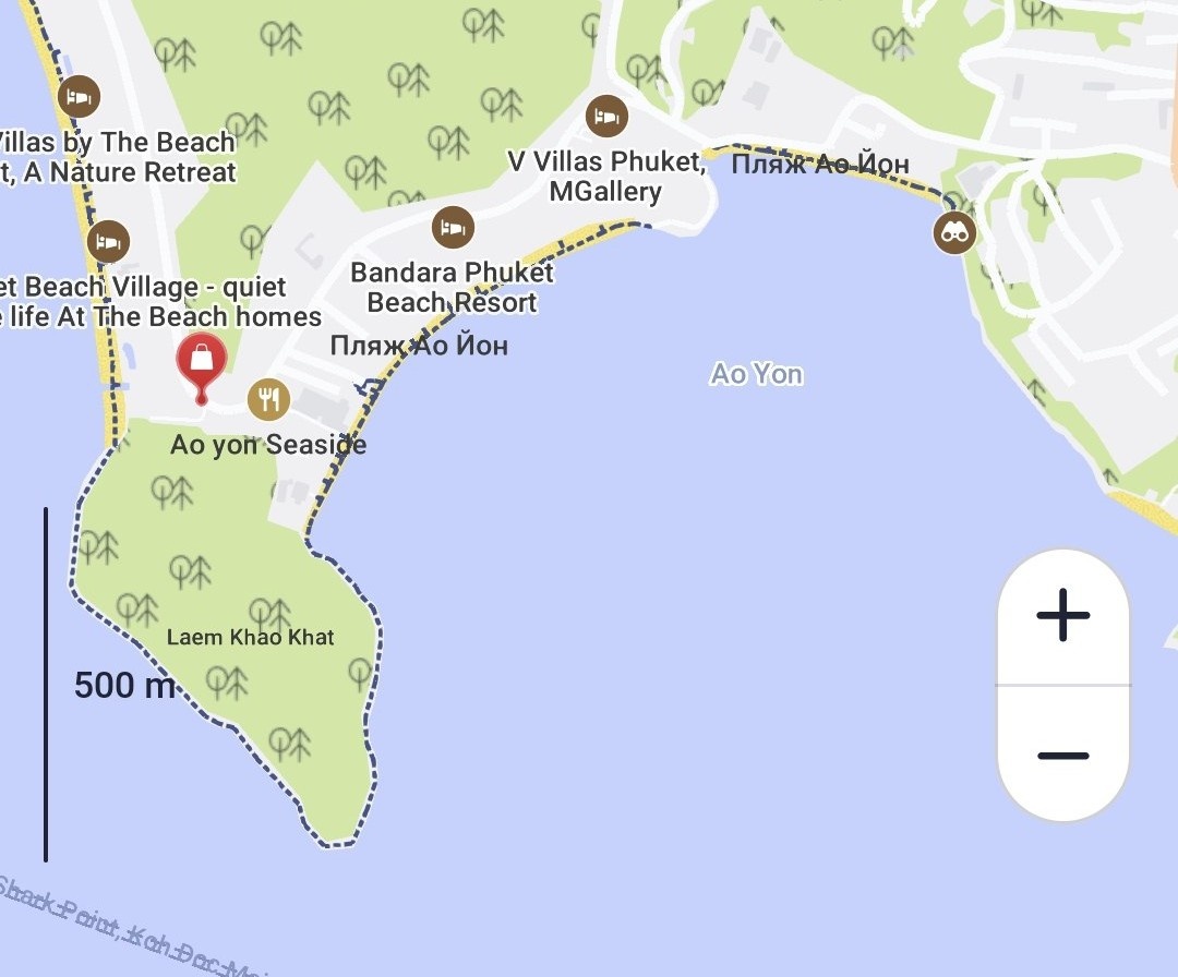 Надоел шумный Патонг или Карон? Добро пожаловать на Ао Йон (Ao Yon), не такой известный и раскрученный, но вполне спокойный и размеренный. Находится в юго-восточной части острова, где можно спрятаться от солнца в тени деревьев и скал. Пляж фактически разделен скалой на две половины: западная и восточная. Подъехать можно в две точки: в районе магазина 7-11 (где можно перекусить, взяв, например, легендарнейших элэвенских сендвичей), отмечено красным. Вторая точка чуть восточнее вдающегося мыса, который разделяет пляж на две части. В восточной части пляжа через небольшую речку перекинут мост, по нему и идём. С моста открывается вид на небольшой залив, назовем его так. Вид с моста на бухту Со скал местные занимаются ловлей рыбы. В качестве приманки - креветка. Если решите идти с восточной точки, то пройдя сотню-другую метров и обойдя скалу выходите на пляж. Здесь отдыхает и купается довольно много местных, причем многие из них - в одежде, что довольно характерно для азиатов. Примерно