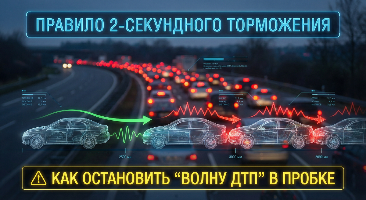 Это “волновой эффект”, который вызывает цепные ДТП даже при скорости 20 км/ч. Но его можно прервать — за 2 секунды. 🛡️ Правило 2-секундного торможения: