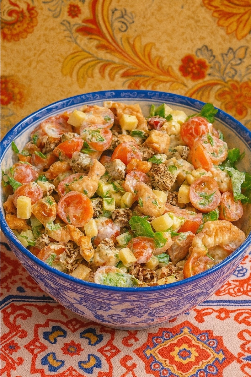 ИНГРЕДИЕНТЫ: ✅ филе индейки или курицы — 200 г ✅ твёрдый сыр — 70 г ✅ помидоры (черри или обычные) — 150 г ✅ ржаной хлеб — 2 кусочка (60 г) ✅ чеснок — 1 зубчик ✅ зелень (петрушка, укроп, кинза) ✅ специи — по вкусу Для заправки: ✅ сметана 15% — 1 ст.л. ✅ горчица — 1 ч.л. (с горошину) ✅ соевый соус — 1 ч.л. ПРИГОТОВЛЕНИЕ: 1. Филе замариновать в специях на 20 минут, затем обжарить без масла и нарезать кусочками. 2. Сыр и помидоры нарезать крупным кубиком. 3. Хлеб подсушить на сковороде, натереть чесноком и порезать на кубики. 4. Зелень мелко порубить. 5. Смешать сметану, горчицу и соевый соус для заправки. 6. Соединить все ингредиенты, добавить заправку и перемешать. ПРИЯТНОГО АППЕТИТА!