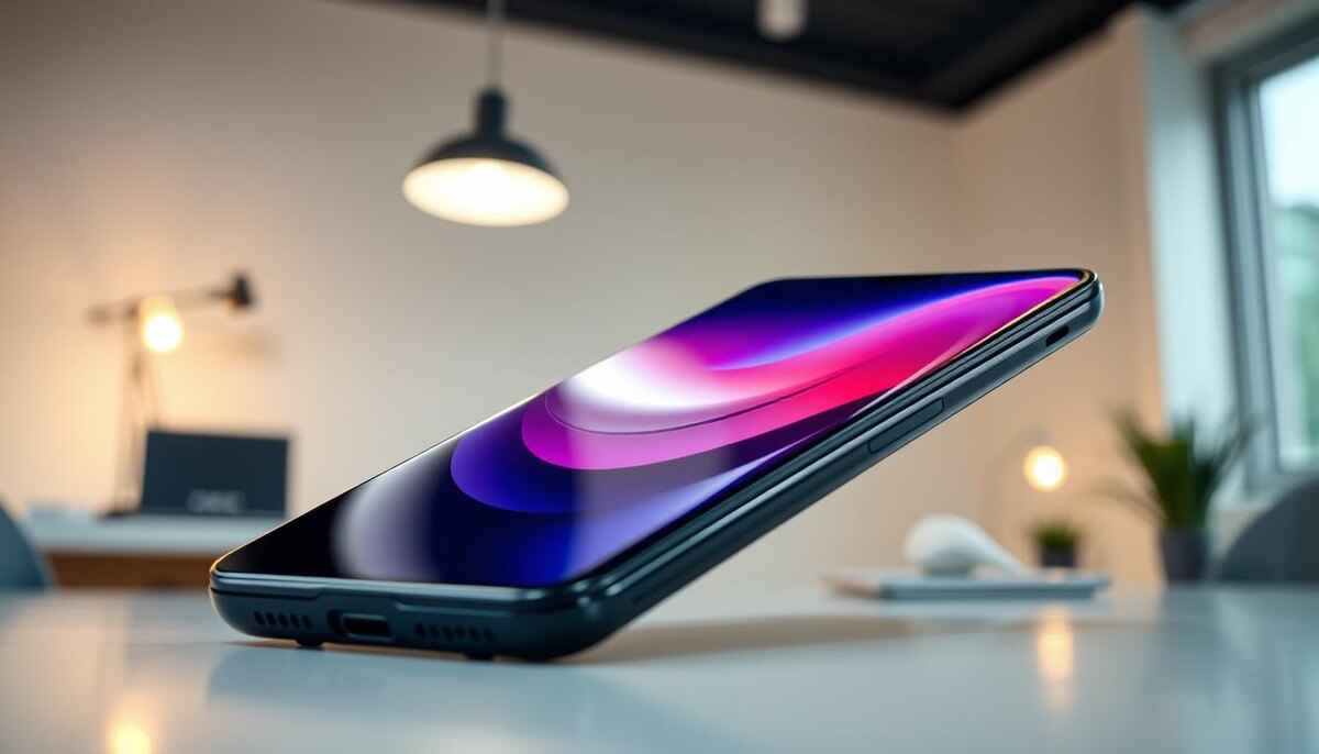 На переднем плане эффектно выделяется элегантный дисплей Samsung Galaxy S25, демонстрирующий яркие цвета и высокое разрешение. Дисплей включен, на нем отображаются анимированные обои, демонстрирующие его возможности, с насыщенными синими и яркими зелеными оттенками. Устройство удобно лежит в руке, подчеркивая его размер и дизайн. На среднем плане мягко размытое современное рабочее пространство с ноутбуком и канцелярскими принадлежностями добавляет контекста, не отвлекая от телефона. Фон представляет собой градиент мягкого света, имитирующий профессиональную студию, что усиливает акцент на передовых технологиях дисплея. Освещение яркое, но рассеянное, создающее четкое и чистое изображение. Атмосфера элегантная и технологичная, вызывающая ассоциации с инновациями и изысканностью.