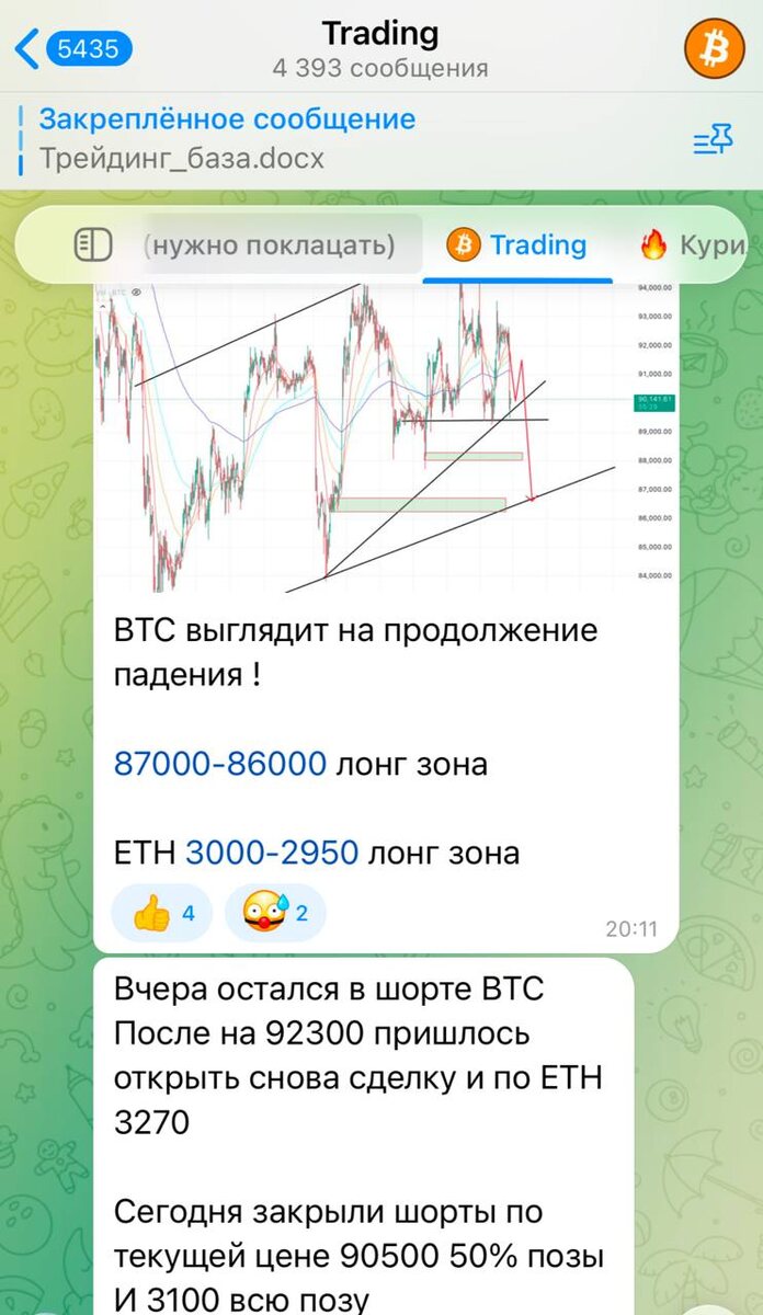 Вот так выглядит нормальный трейдинг, а не крипто-шаманство 🧠📉 Без «туземуна к пятнице». Без «мне кажется». Без сигналов из воздуха. На скрине — рабочий чат: — заранее обозначенные зоны, — живые входы, — сопровождение позиций, — фиксация по факту, а не задним числом. BTC: шорт → частичное закрытие → полная фиксация. ETH: повторный вход → закрытие всей позиции. Никакой магии. Только дисциплина и контекст рынка. Именно так работают хантеры: — ловят движения, а не мечты, — думают сценариями, — не женятся на позициях, — не боятся фиксировать. Если ты: — устал от «гуру» с вечным лонгом, — хочешь видеть реальный процесс, — понимать, почему вход, где выход и что делать дальше 👉 добро пожаловать в чат Хантеров. Забирай место со скидкой и подключайся к движу! ВСТУПИТЬ СО СКИДКОЙ