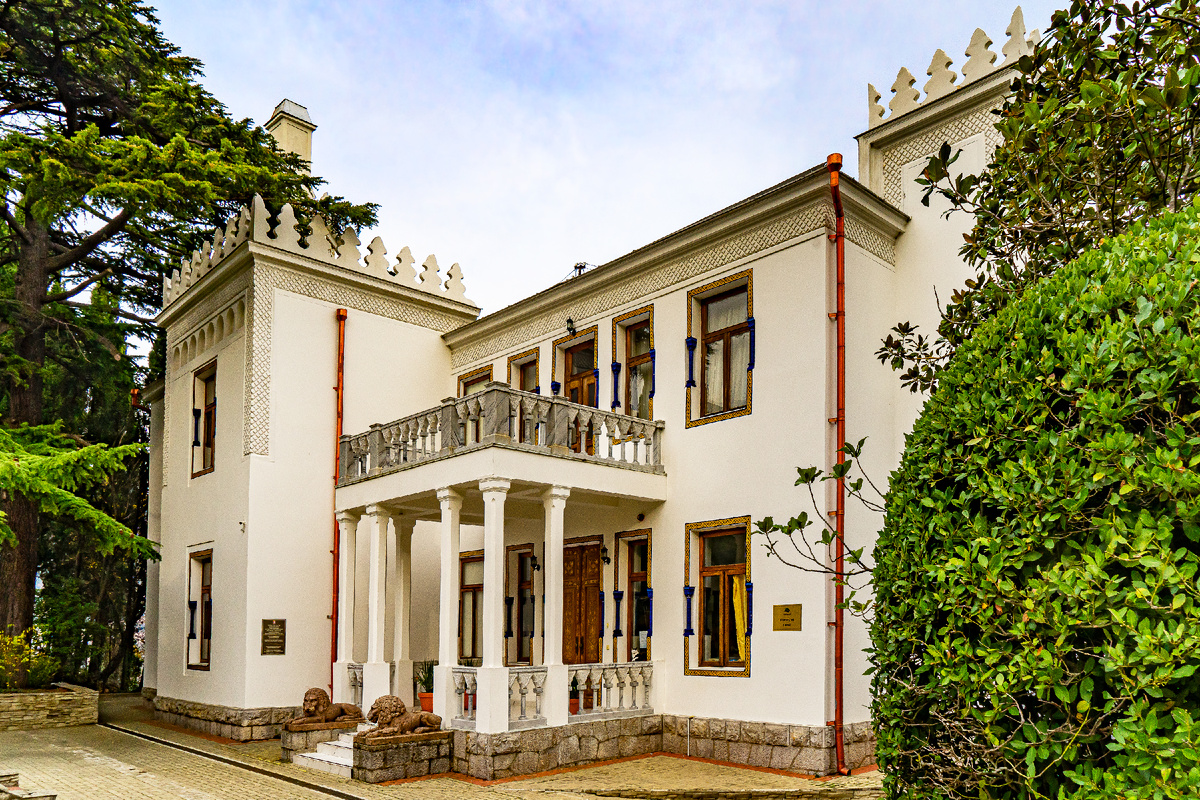 Надо сказать, информации в сети про это место не так много и она почти везде напутана. Дело в том, что в Ялте есть еще один дворец эмира Бухарского в санатории «Ялта», принадлежащем Министерству обороны. И вот он, собственно говоря, и есть дворец эмира и построен он архитектором Николаем Георгиевичем Тарасовым. А «Джио-хан-Ора», построенный Красновым – это получилась такая летняя дача эмира. Интересное и симпатичное сооружение, безусловно, хотя и слишком простое для восточного правителя. В поместьях современных «уважаемых людей» средней руки, такой дворец годится только в качестве домика для прислуги. Но какая керамика, какая резьба по дереву и камню! Ау ж львы!