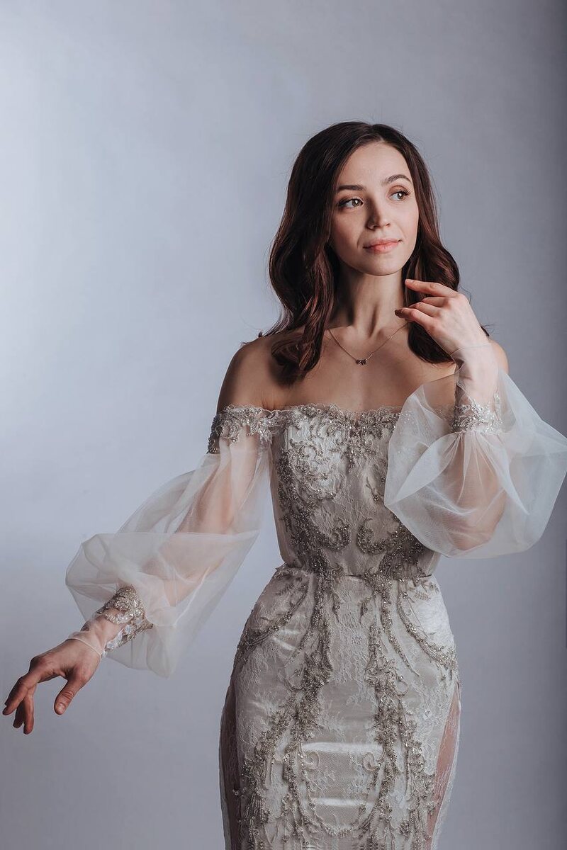 🌟Иногда платье — это не просто наряд. Это история, воплощенная в ткани. 🪞Представьте себе силуэт «Рыбка»: облегающий лиф, подчеркивающий талию, и мягкий, струящийся шлейф, который чудесно колышется при каждом шаге. Он не кричит, а шепчет о грации. 🌼Это платье для тех, кто хочет чувствовать себя загадкой. Для вечера, который запомнится. Для создания момента, где вы — главное украшение.