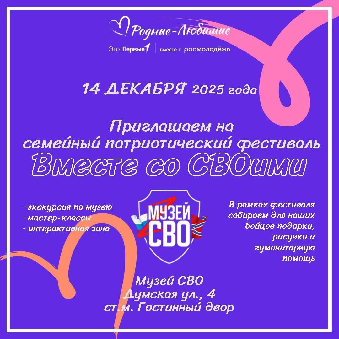 ХУДОЖЕСТВЕННЫЕ ВЫХОДНЫЕ в Музее СВО в честь Дня Героев Отечества! 👊 В субботу, 14 декабря, Музей СВО Санкт-Петербурга совместно с семейным обществом «Родные-Любимые» проводит семейный патриотический фестиваль «Вместе со СВОими». В программе: ⚡️Экскурсия по Музею СВО; ⚡️Мастер-класс по тактической медицине; ⚡️Мастер-класс по плетению маскировочных сетей; ⚡️Интерактивная зона с симуляторами БПЛА; ⚡️Однодневный конкурс рисунков для последующей передачи их на фронт. Ждём Вас! 📍 Музей СВО, ул. Думская, д. 4, Санкт-Петербург 🗓14 декабря 12:00 ⭐️ Вход свободный, по предварительной записи* Запись через бот связи: t.me/muzSVObot Телефон для связи: +7-931-333-94-55 В Музее СВО есть возможность оставить пожертвования на помощь фронту и развитие Музея. #культфронт