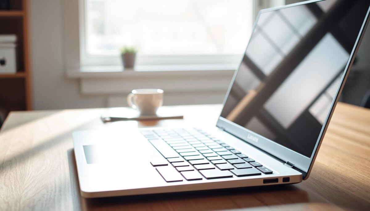 Стильный и современный ноутбук "LUNNEN Ground 15 (2025)" в стильной офисной обстановке, демонстрирующий элегантный дизайн. Ноутбук открыт и оснащен ярким IPS-экраном Full HD с красочными обоями, подчеркивающими его тонкие рамки. На переднем плане мягкие тени, отбрасываемые естественным светом, проникающим через соседнее окно, придают помещению теплоту. В центре - минималистичный письменный стол с несколькими канцелярскими принадлежностями, подчеркивающий профессионализм рабочего пространства. На заднем плане, слегка размытые офисные элементы, такие как книжные полки и растения, создают современную атмосферу. Общее настроение лаконичное и утонченное, подчеркивающее эргономичность и эстетическую привлекательность ноутбука. Композиция должна выделять ноутбук на видном месте, обеспечивая отсутствие видимого текста, логотипов или опознавательных знаков и сохраняя чистый, профессиональный внешний вид.