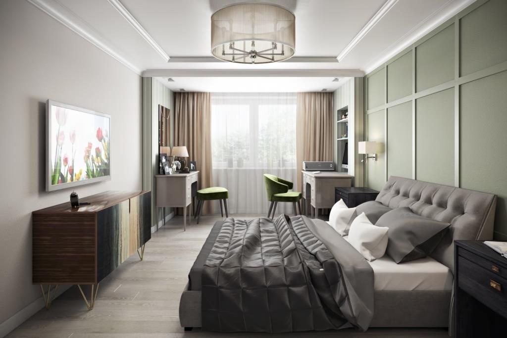 Функциональное пространство. Эта спальная комната имеет две функциональные зоны: возле окна - зона бодрствования - выделена выступающей плоскостью с полосатыми обоями и опущенным потолком; зона сна - выделена умиротворенным зеленым цветом за изголовьем кровати, а потолок увенчан светильником с текстильным абажуром. Проект - #АЧ_Функциональный_Аспект