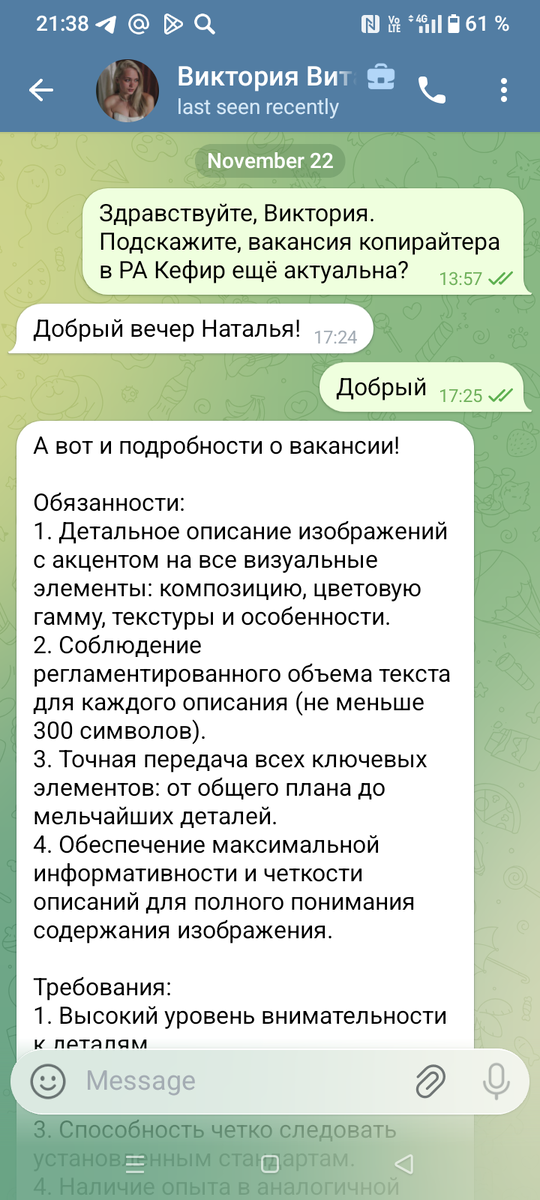 подумала я и сохранила это объявление в Избранном в Телеграме. и вот сейчас, находясь в поисках работы я вспомнила о нем и решила откликнуться.Написала по указанным контактам