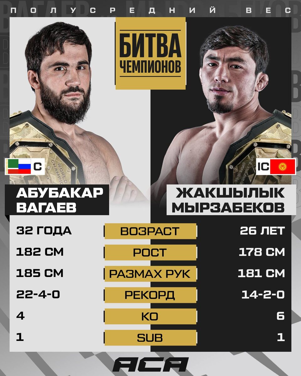 🔝Их объединяет рейтинг лучших бойцов вне зависимости от весовых категорий. Им обоим принадлежит титул чемпиона АСА. Они оба — бойцы экстра-класса. Но только одному из них суждено остаться на вершине. 🏆Самый высококлассный поединок в истории дивизиона до 77 кг, в котором определится обладатель полноправного чемпионского титула — АБУБАКАР ВАГАЕВ VS ЖАКШЫЛЫК МЫРЗАБЕКОВ! Пишите в комментариях, у кого больше шансов сохранить свой титул?