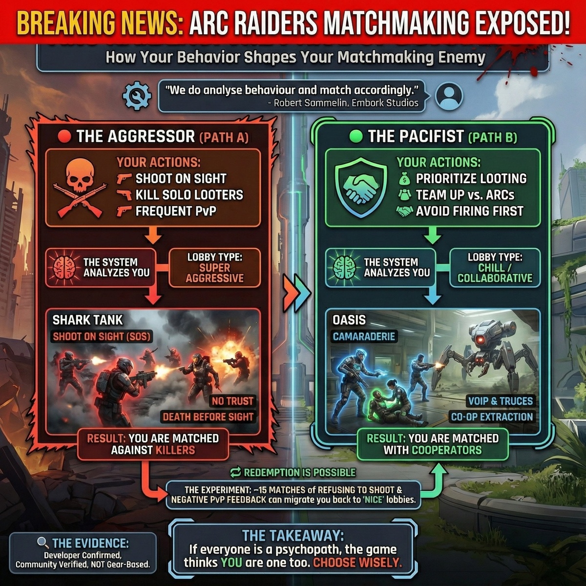 Выяснилось, что в ARC Raiders есть скрытый пул для токсичных игроков. Разрабы рассказали, что в игре есть матчмейкинг: • Стреляешь первым в каждого увиденного игрока? Попадаешь в лобби к таким же злодеям; • Доджишь всё PvP и орёшь «dont shoot»? Попадаешь в лобби к PvE игрокам. Отправляем тем самым токсикам. CtrlAltDelights- подписаться