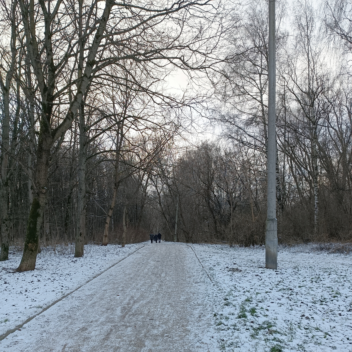 13 декабря 2025 года Здравствуйте, друзья! Зима в этом году решила всё же не ждать "третьего в ночь", имеется в виду январь, как описывал Александр Сергеевич Пушкин, а заглянуть к нам ещё в декабре, в ночь на 13-е. Снега выпало хотя и немного, но на термометрах стыл вполне приличный минус. Куда бы выйти прогуляться? По своему району бродить скучно, прогулки по ближайшему лесу мои читатели не одобрили, и даже предостерегали, новогодние украшения хороши лишь дозированно. Ближайший к моему дому цивилизованный парк - Терлецкий, его ещё называют Терлецкая дубрава. Я в нём была всего один раз, летом, года четыре с лишним назад, хотя проезжаю мимо него каждый раз, как еду в Москву. Но ведь у нас как? В Волоколамск съездить - одним днём собраться, в Люблино - только с навигатором свериться, а то что рядом, остаётся без внимания. Хорошо, что исправить это недолго, вышла из дома, дождалась маршрутку и уже минут через 15 выхожу на остановке, которая так и называется "Терлецкий парк". О надвигаю