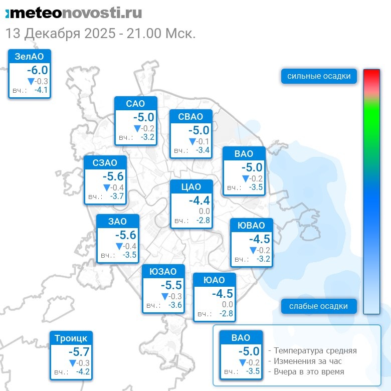 В 21:00 в Москве было от -6.4°C до -4°C, средняя температура -5.1°C #погода #Москва #зима #температура #13декабря #суббота