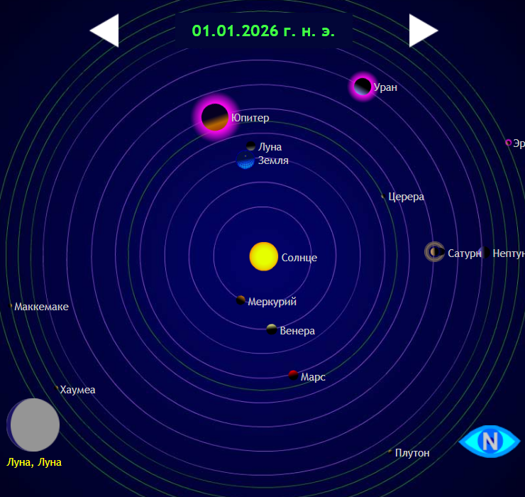 Эти новогодние праздники можно смело назвать — Радость Козерога! Потому что по поводу положения планет, в Новогоднюю ночь, могут испытывать романтические фантазии, только, астрономы и то непонятно почему? Вернее как, серьезные астрономы, скорее всего не станут писать посты про «уникальный, редкий парад планет» и зачем-то приплетать Вифлеемскую звезду, потому что не то что Вифлеемской, в Новогодние дни не будет, а вообще никаких. Из всех планет Солнечной системы, только, Полная луна, будет сиять в ночном небе, закрывая собой Юпитер — единственную планету, которая будет прекрасно видна на зимнем небосводе, сверкая как белоснежный фонарь, но в дни Новолуния и при условии что не будет облачности, в чем я очень сомневаюсь. Вот так будет выглядеть реальное положение планет, в Новогоднюю ночь.