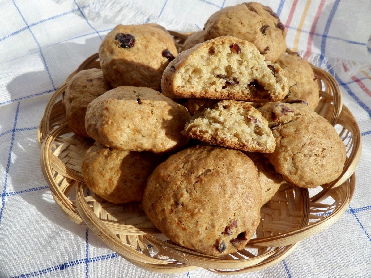 Ингредиенты: овсяные отруби — 30 г мука самоподнимающаяся — 180 г растительное масло — 5 ст. л. яблочный сок — 100 мл сахар — 50 г клюква вяленая — 50 г соль — 1 щепотка Способ приготовления: 1. Подготавливаем продукты. 2. В чашку выкладываем сахар, овсяные отруби, щепотку соли и вяленую клюкву. Перемешиваем сухой ложкой. 3. Добавляем яблочный сок с мякотью и растительное масло. Перемешиваем ложкой. 4. Добавляем просеянную муку (я использовала самоподнимающуюся муку, если используете обычную пшеничную муку, тогда нужно будет добавить в тесто разрыхлитель). 5. Замешиваем тесто. 6. Влажными руками формируем из теста небольшие шарики. 7. Выкладываем на противень, застеленный пергаментом. 8. Помещаем противень в разогретую духовку и выпекаем печенье 20 минут при 180°С (ориентируйтесь посвоей духовке). 9. Остужаем и подаем печенье. Приятного аппетита!