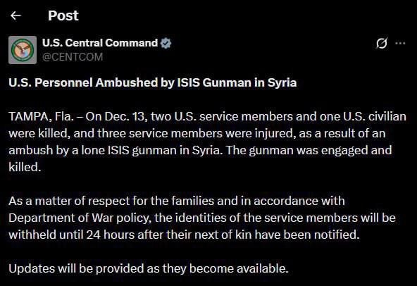 В ответ на пост 🚫Два военнослужащих США и один гражданский переводчик погибли во время операции против *ИГИЛ в сирийской Пальмире, трое ранены, сообщил помощник министра войны США Шон Парнелл. *Организации ЗАПРЕЩЕНЫ❗️ на территории РФ. #сша #сирия 💬 Two US military personnel and one civilian translator were killed during an operation against ISIS in Palmyra, Syria, and three were wounded, US Assistant Secretary of War Sean Parnell said. *Organizations are PROHIBITED❗️ on the territory of the Russian Federation. #usa #syria