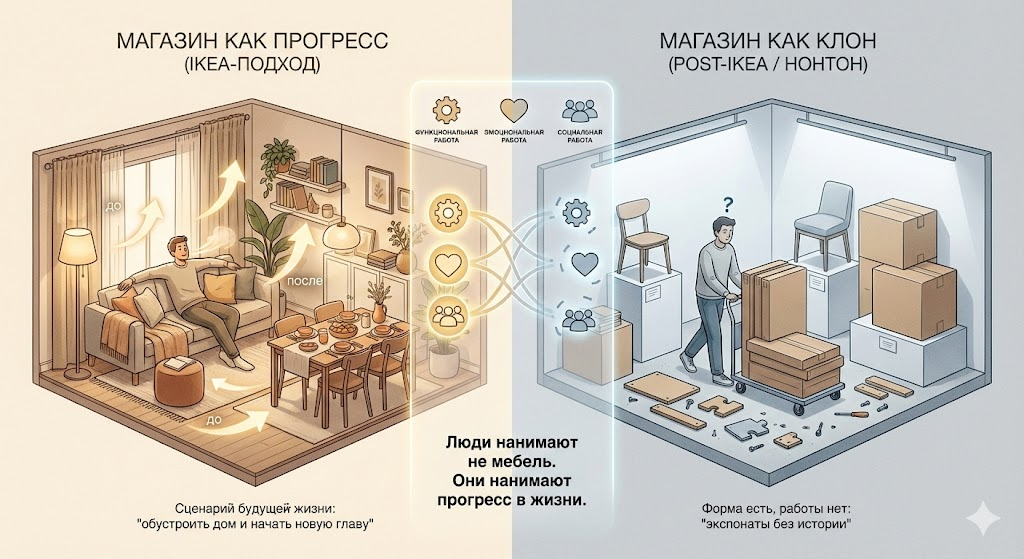 Прежде чем винить Нонтон, давайте вспомним идею Jobs To Be Done (JTBD). Она учит: человек «нанимает» магазин не ради самого товара, а чтобы решить свою жизнь задачу. Проще говоря, речь не просто о «купить мебель», а о том, зачем она ему нужна. Например, в голову покупателя могут приходить цели типа «обустроить новую квартиру», «рассказать себе и другим: у меня уютный дом», «разгрузить голову от бытовых забот». То есть, есть работа (Job) - жизненная задача, есть прогресс - какой результат в жизни хочется получить, и есть напряжение (страгл) - внутренний дискомфорт, из-за которого он ищет решение.