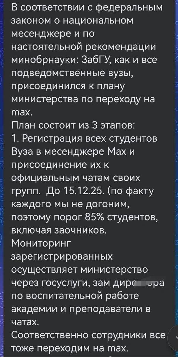 Студентов ЗабГУ переводят в МАХ и грозят, что без него обучение будет невозможным. Преподаватели вуза рассылают студентам сообщения о том, что по настоятельной рекомендации Минобрнауки ЗабГУ, как и остальные подведы, присоединился к плану министерства по переходу на национальный мессенджер. Но информацию о том, что поступление без МАХ будет невозможно, в вузе не подтвердили. 🗯 В сообщениях студентам преподаватели пишут, что всем нужно зарегистрироваться в системе MAX до 15 декабря. Важно, чтобы это сделали минимум 85% всех студентов, включая заочников. К началу 2026 года MAX станет главной учебной платформой университета, похожей на «Сферум». У каждого студента там будет электронная зачетка. А летом следующего года, благодаря связи с Госуслугами, через MAX можно будет заказывать справки об обучении, выписки, подавать заявления и выполнять другие действия: На этом этапе в MAX будет переведена приемная комиссия, и поступление в государственный вуз без MAX станет невозможно […] На т