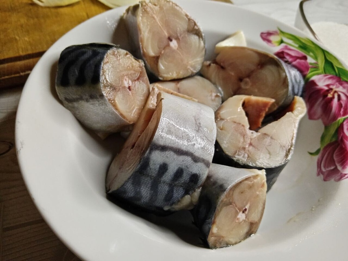 Данное количество рассчитано на 2 штуки скумбрии. Рыбу чищу, мою, нарезаю на кусочки. Складываю в миску. Сверху на рыбу насыпаю приправу, соль, сахар. Добавляю лавровый лист и лук, нарезанный полукольцами.